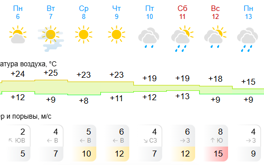 Самым теплым днем на новой неделе в Астрахани станет вторник, 7 октября. В этот день дневная температура воздуха буде прогреваться до +25°. К четвергу, 9 октября, отхлынет до +22...+23°. А вот в пятницу снижение температуры будет более ощутимым. Обещают, что дневной максимум упадет до +18°. К тому же с пятницы погода уже не будет такой безоблачной - в город придут дожди. Гисметео передает дожди на протяжении четырех дней подряд с 10 по 13 октября. Особенно сильные в субботу и понедельник - 11 и 13 октября. Яндекс.Погода обещает небольшие дожди в пятницу и в воскресенье.