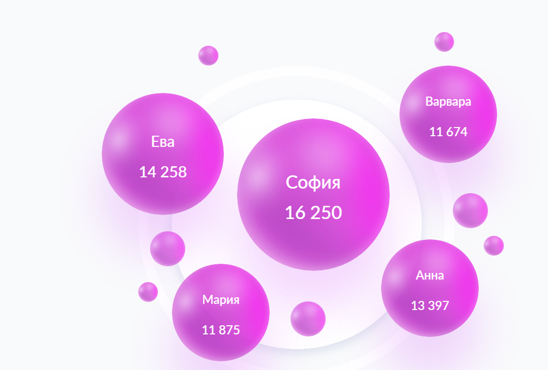 Самое популярное женское имя в России, по данным на 10 октября 2025 года, — София. Это имя стало лидером 2025 года. Так назвали 16250 девочек в РФ. Это имя греческого происхождения, означающее «мудрость». Оно сочетает в себе культурное наследие и современные тенденции. София ассоциируется с интеллектом, добротой и красотой, что делает её привлекательной для родителей.