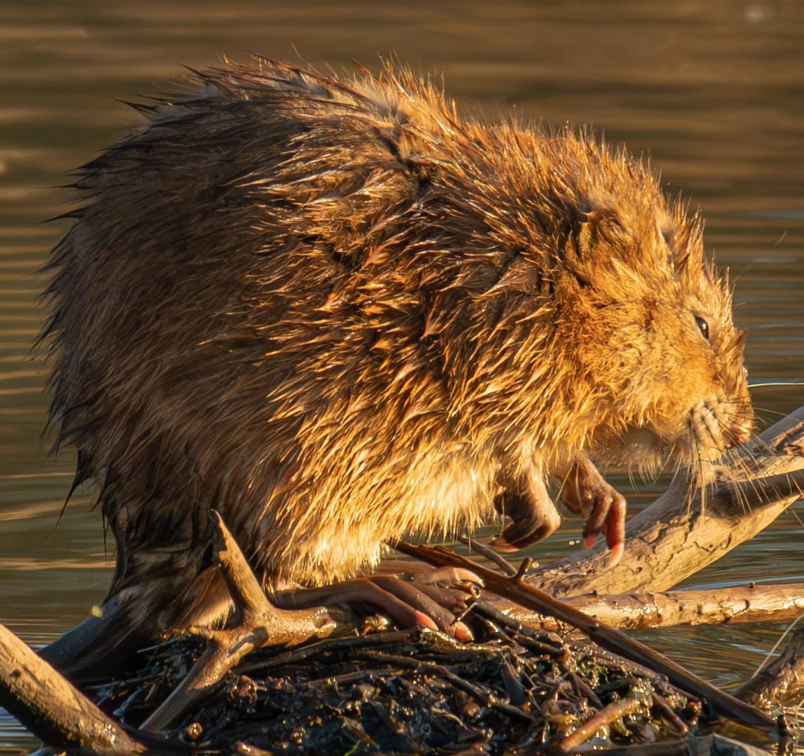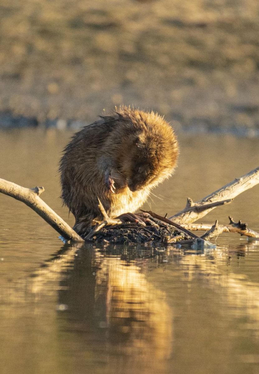 Когда я приблизилась, ондатра уже завершала трапезу и приступала к вечерним процедурам. С поразительной тщательностью она умывалась, приводя себя в порядок. А затем, плавно скользнув в воду, направилась к своей хатке — видимо, готовиться ко сну.