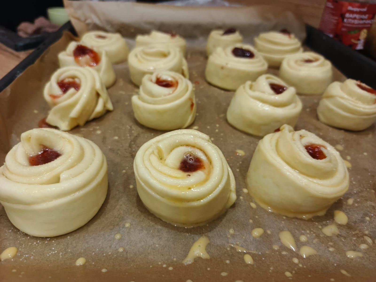 Когда налепили все эти булочки, ставим на противень, накрываем пакетиком и ждем 30 минут. Перед тем, как класть в духовку, смажьте их желтком. Кладем в духовку, разогретую до 180 градусов, на 25 минут. Всё. Булочки готовы.