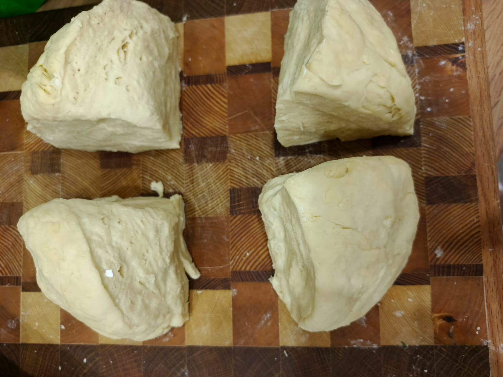 Теперь в эту емкость аккуратно добавляем 700 гм муки. Делаем тесто, но не даем ему отстояться. Сразу же делим его на 4 части, накрываем пакетиком и оставляем на 10 минут.
