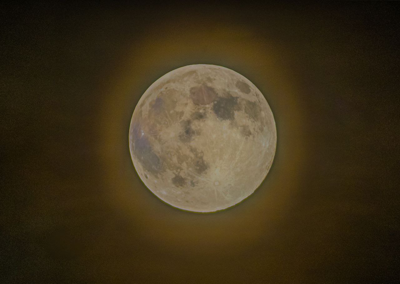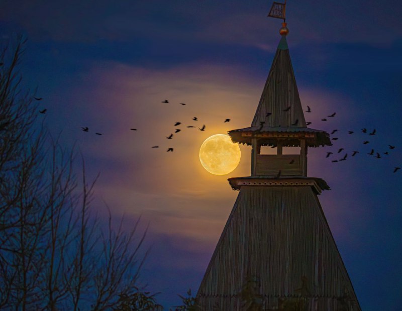 Мимолётные стайки птиц, прорезающие ночное небо, добавляют динамику и жизнь в пейзаж с Луной. На какое‑то мгновение вокруг Луны появились венцы — световые кольца, рождённые преломлением лунного света в облаках.