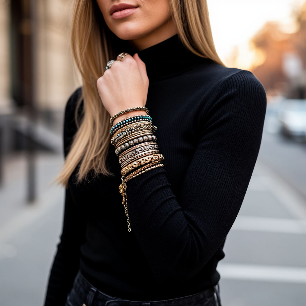 По поводу аксессуаров — чем их больше и чем они больше, тем лучше. Можно сразу пять огромных браслетов на одну руку или три разных колье на шею.