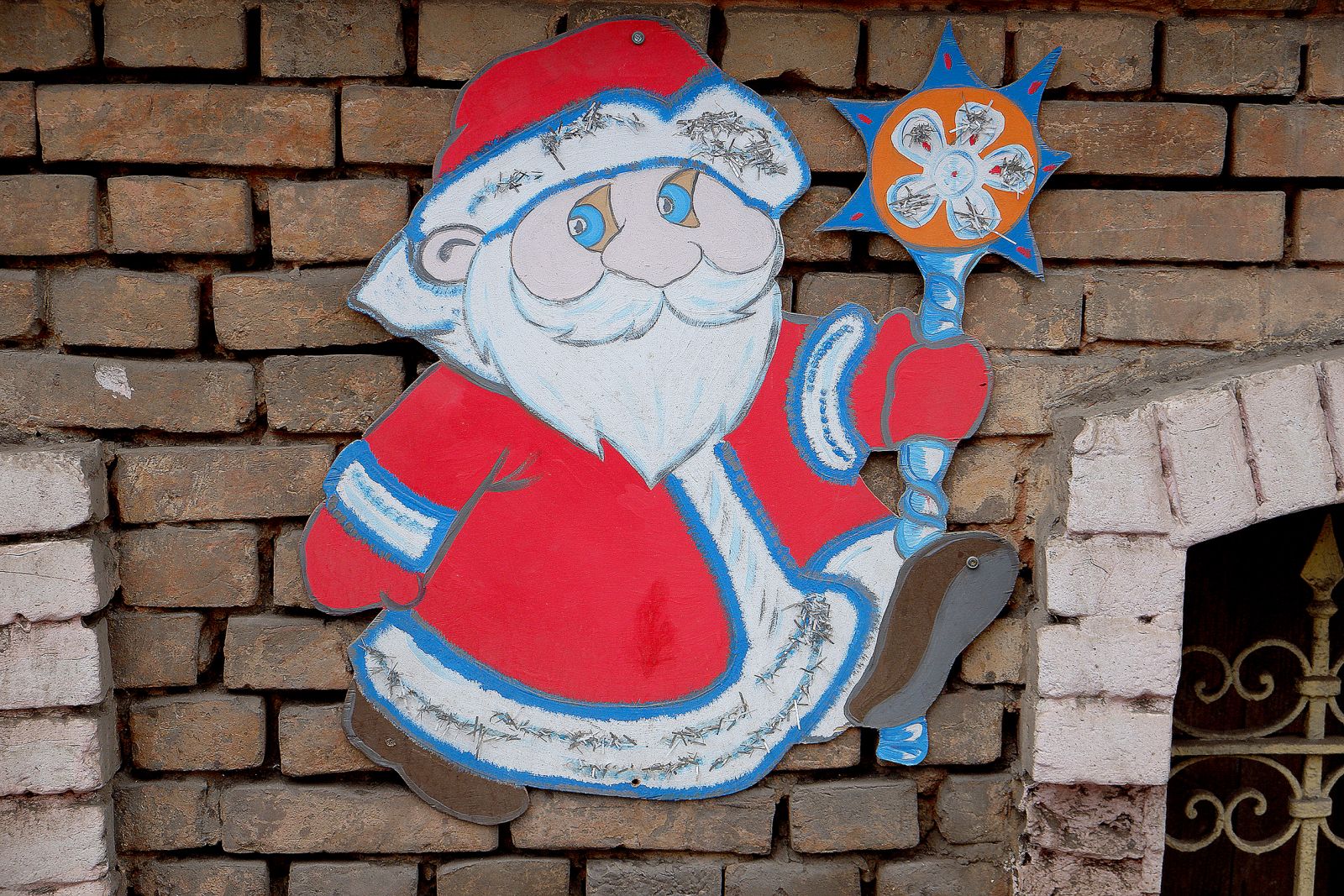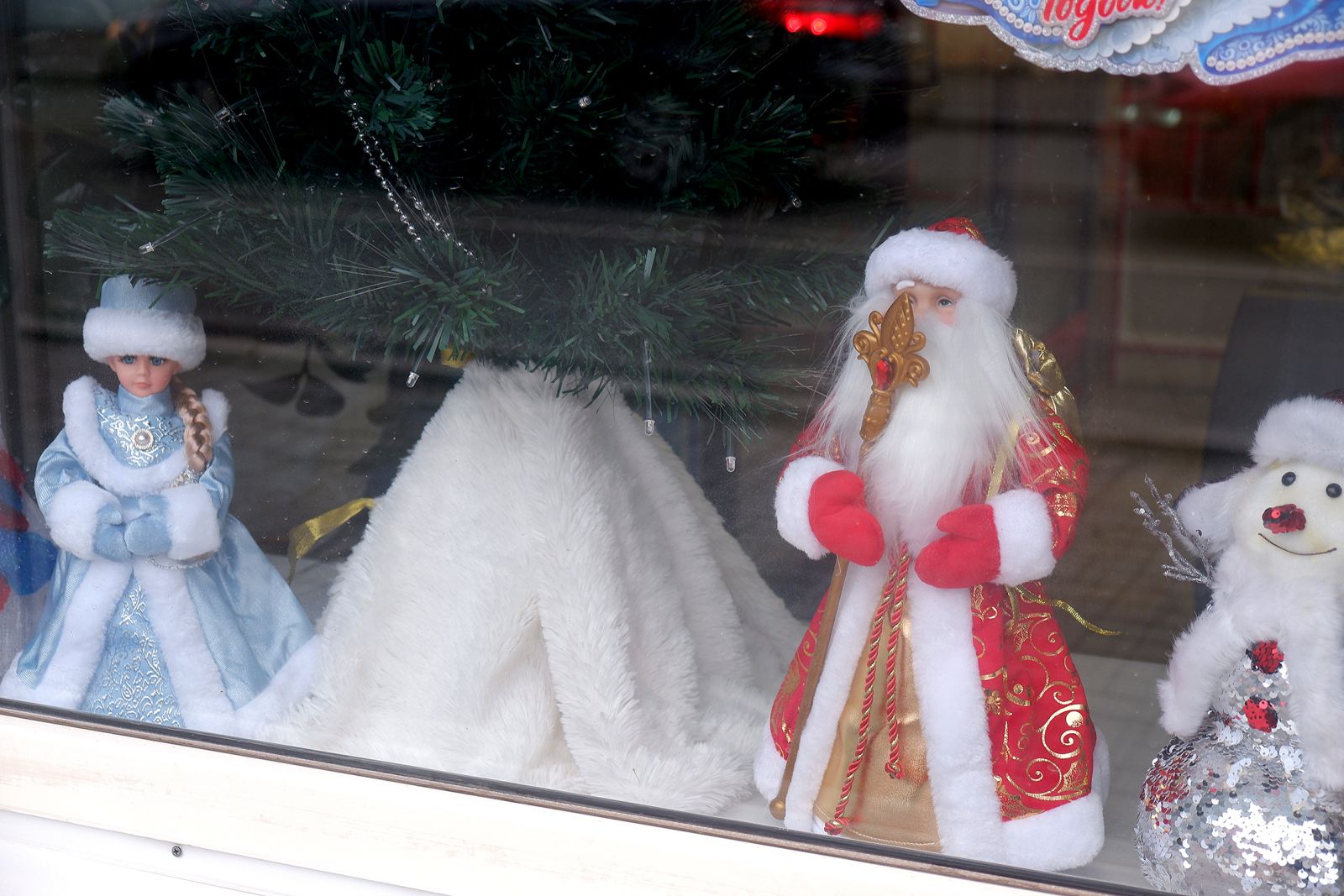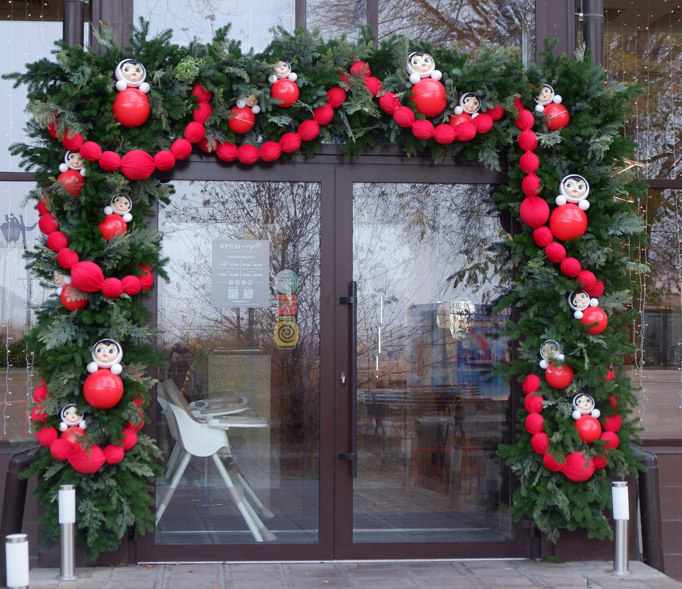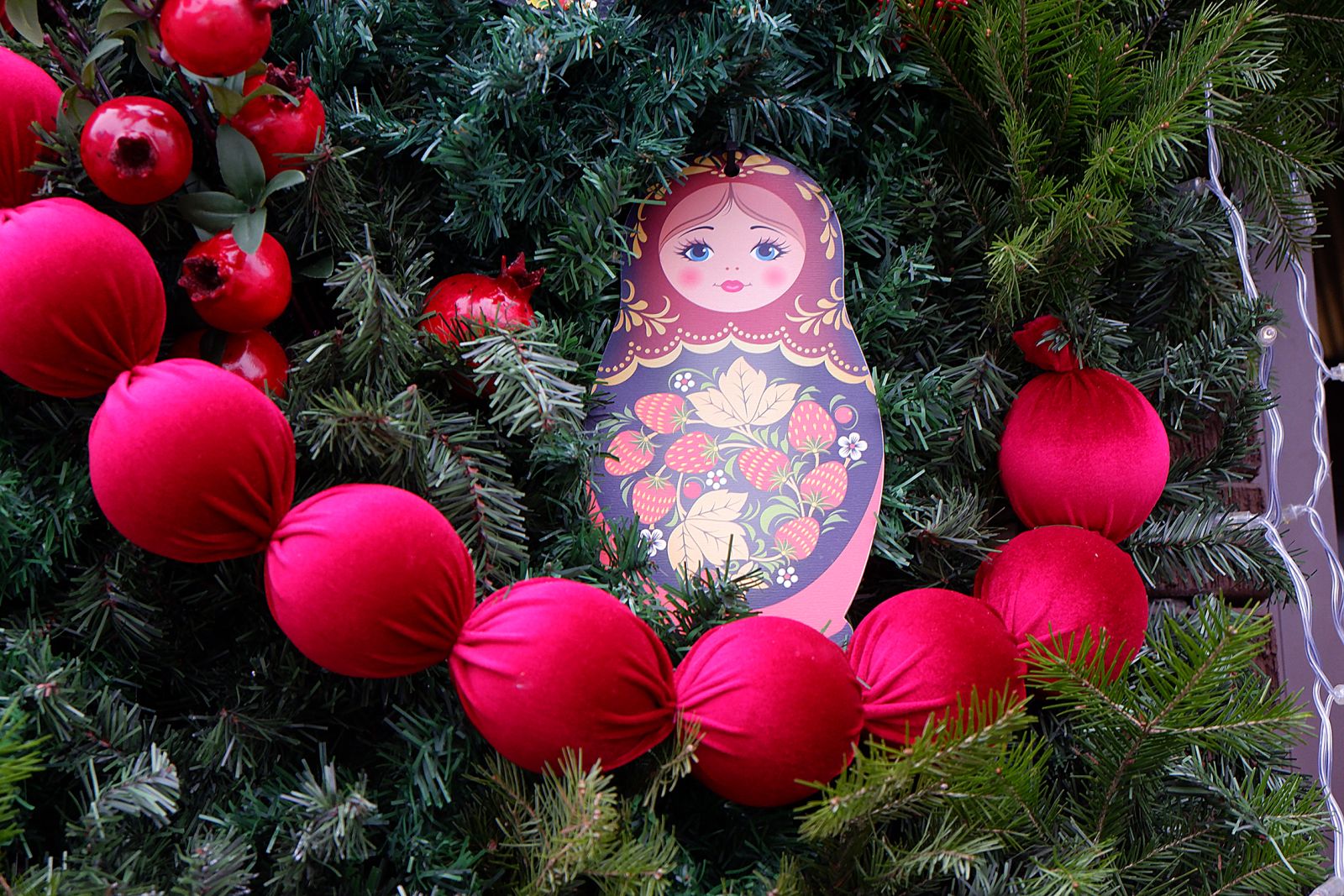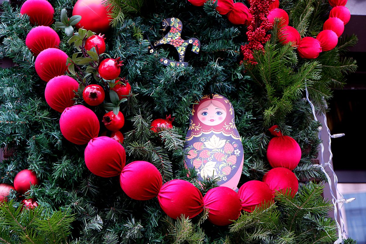 На ёлках и в украшениях можно заметить традиционные русские элементы: матрёшки, неваляшки, бублики и красные бусы, традиционные Дед Морозы. На верхушках ёлок появились рождественские звезды.