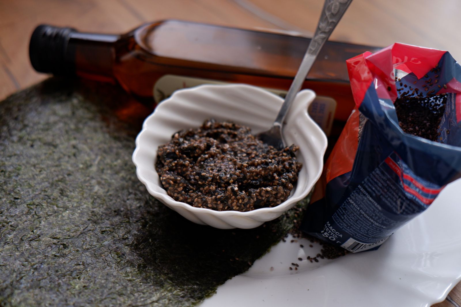 Приготовление: семена чиа заливают тёплой водой и оставляют набухать на 10–15 минут, периодически перемешивая. Затем нори измельчают в блендере, добавляют к семенам чиа, соевый соус и растительное масло, после чего дают смеси настояться.