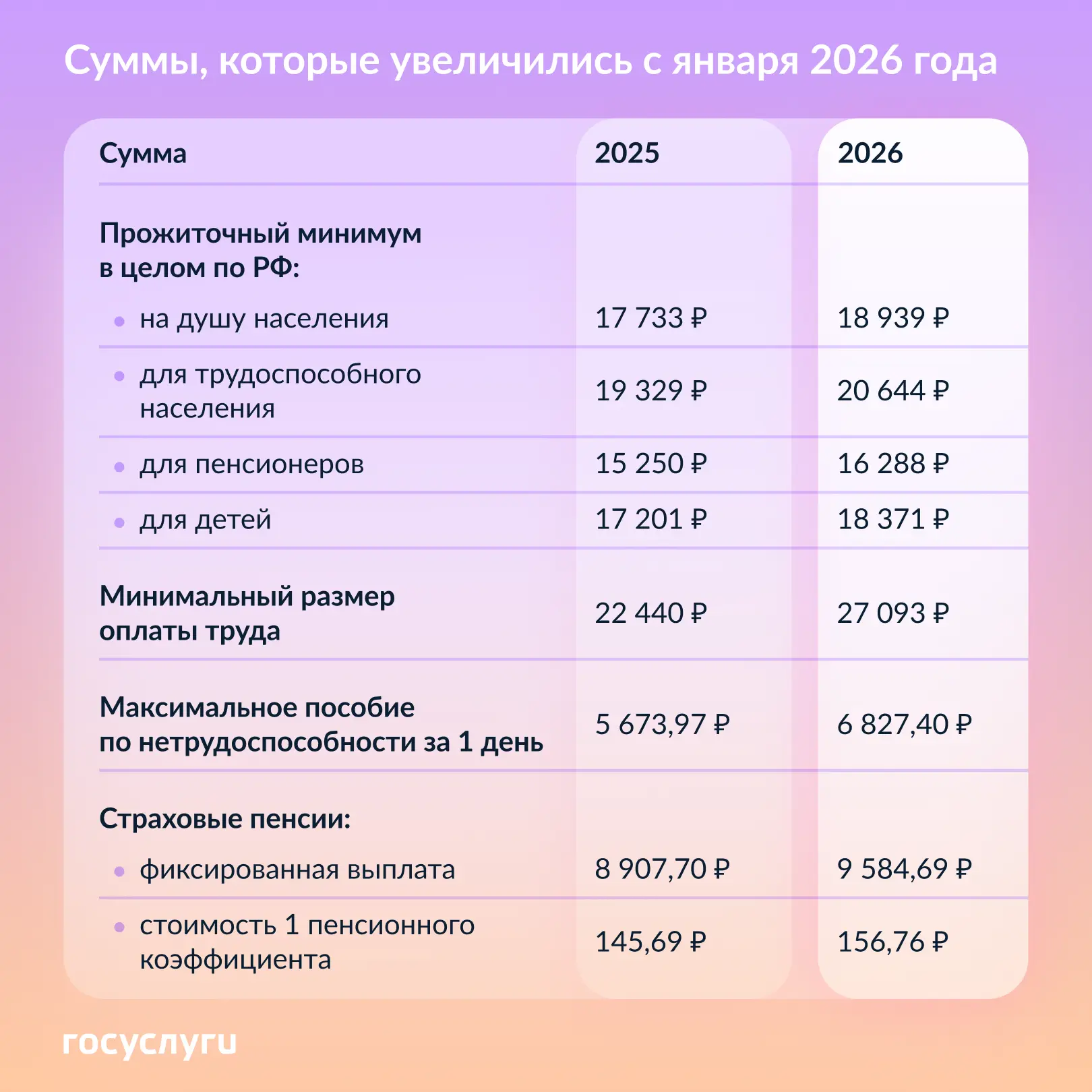 Прожиточный минимум на душу населения в России увеличился с 17 733 до 18 939 рублей. Минимальная зарплата выросла с 22 440 до 27 093 рублей. Максимальный размер больничного пособия за день возрос с 5 673,97 до 6 827,40 рублей. Кроме того, выросла фиксированная выплата к страховой пенсии и стоимость 1 пенсионного коэффициента.