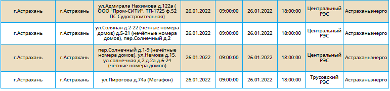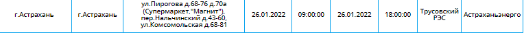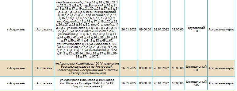 График плановых отключений на 26 января в Астрахани: