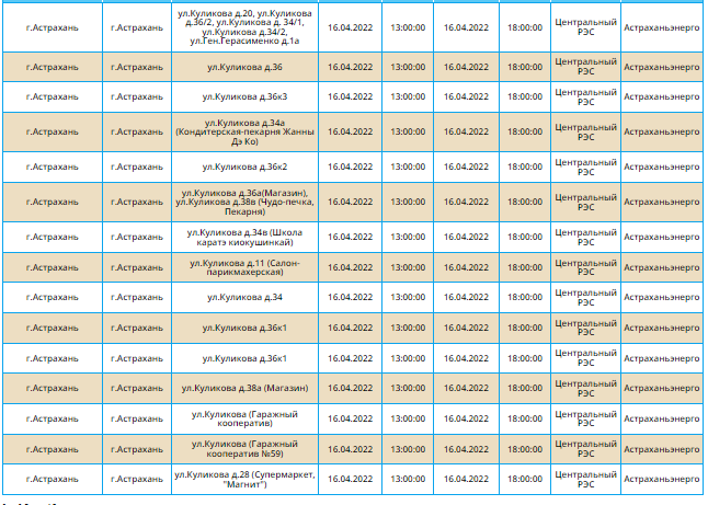 График плановых отключений электроэнергии на 16 апреля в Астрахани: