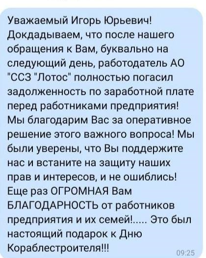 "С утра в социальных сетях получаю благодарности от корабелов. От себя благодарю руководство Объединённой судостроительной корпорации и Министра промышленности и торговли РФ Дениса Валентиновича Мантурова, который после нашей встречи лично приложил усилия к решению данной проблемы", -написал глава региона на своей странице в соцсети.