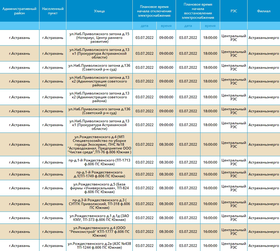 Завтра, 3 июля, в Астрахани пройдут плановые отключения электроэнергии.