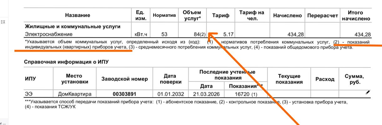 То что показания учтены при начислении платы также видно в квитанции. На картинке ниже на это указывает оранжевая стрелка.