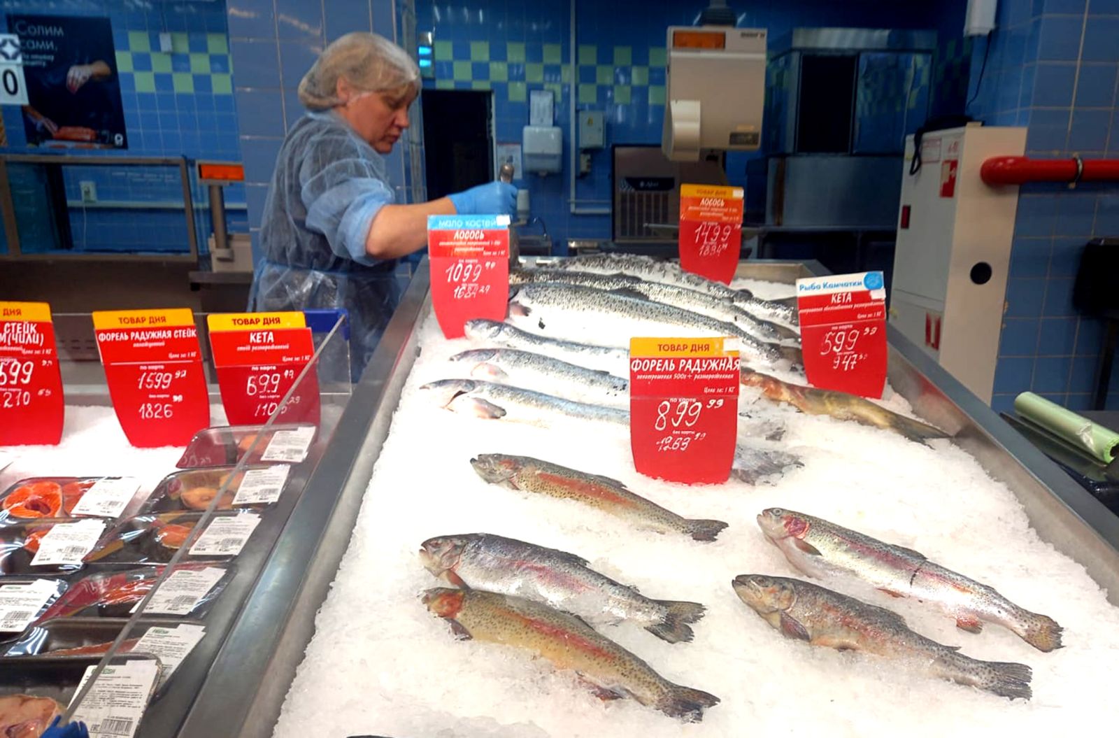 Для тех, кто готов потратить больше, на прилавках можно найти форель, сёмгу, тунца, горбушу, кету, дораду, сибаса и другие деликатесные виды. Цены на них варьируются в зависимости от вида рыбы и способа продажи. Например, одна небольшая охлаждённая форель или кета с головой будет стоить 400–500 рублей. Горбуша, голец, лакедра и терпуг обойдутся дешевле.