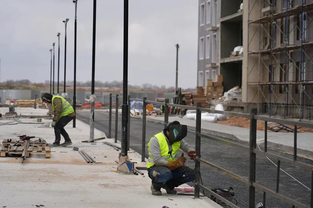 На стройплощадке трудятся около 55 человек. Они монтируют вентилируемые фасады, создают слаботочные системы и готовят помещения к черновой отделке. Внутри домов и общих пространств выполняют электромонтажные и сантехнические работы: проводят электричество, воду, канализацию и отопление. Устанавливают окна, укладывают кровлю и благоустраивают территорию вокруг домов.