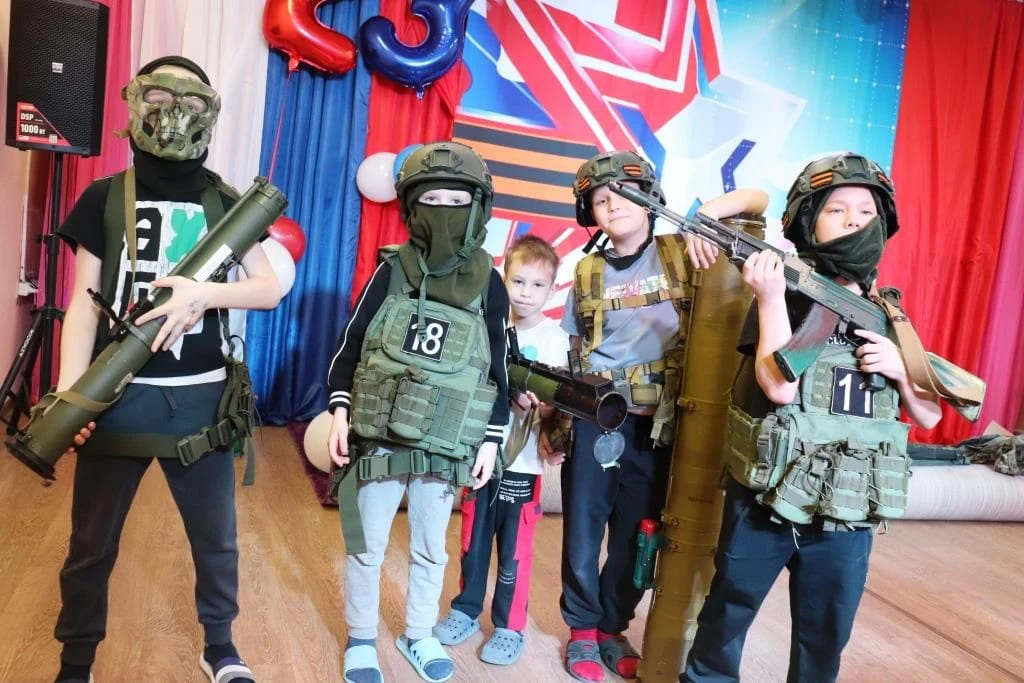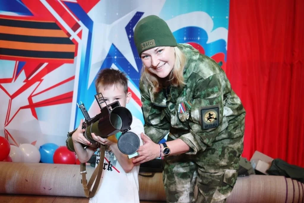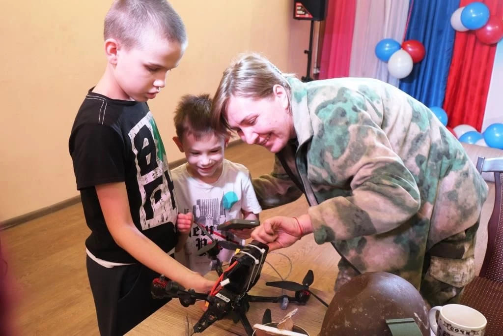 Волонтёры привезли оружие, обмундирование и дроны, захваченные в зоне спецоперации. Ребята смогли примерить экипировку, потренироваться в сборке и разборке оружия.