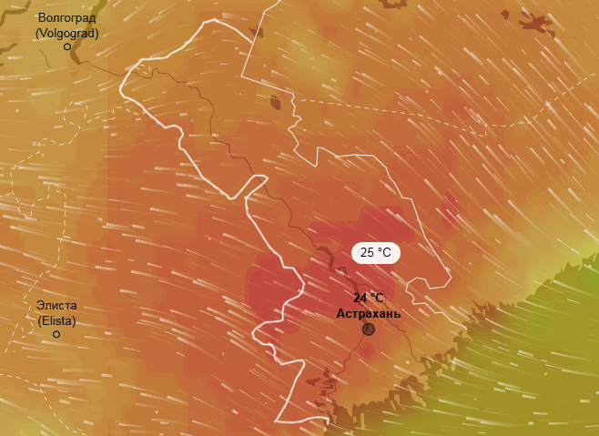 По данным метеоресурса Ventusky, температурные максимумы +25° в Астраханской области будут наблюдаться на территориях Красноярского, Наримановского и Харабалинского районов.