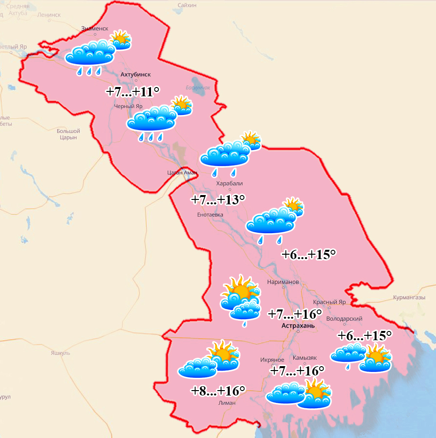 - Астрахань: ночью и утром +7°, днем +16°, облачно с прояснениями, днем незначительные осадки, ветер 3-7 м/с, порывами до 12-13 м/с.