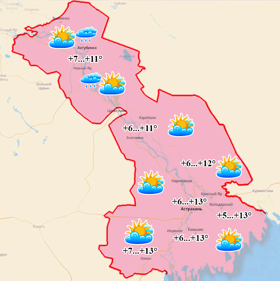 - Астрахань: ночью и утром +6°, днем +13°, утром и днем облачность до 100% с существенным прояснением к вечеру, возможно выпадение незначительных осадков, ветер 2-5 м/с.