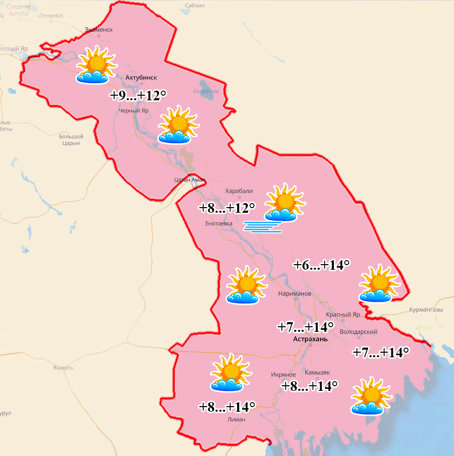 - Астрахань: ночью и утром +7°, днем +14°, переменная облачность, ветер 2-4 м/с.