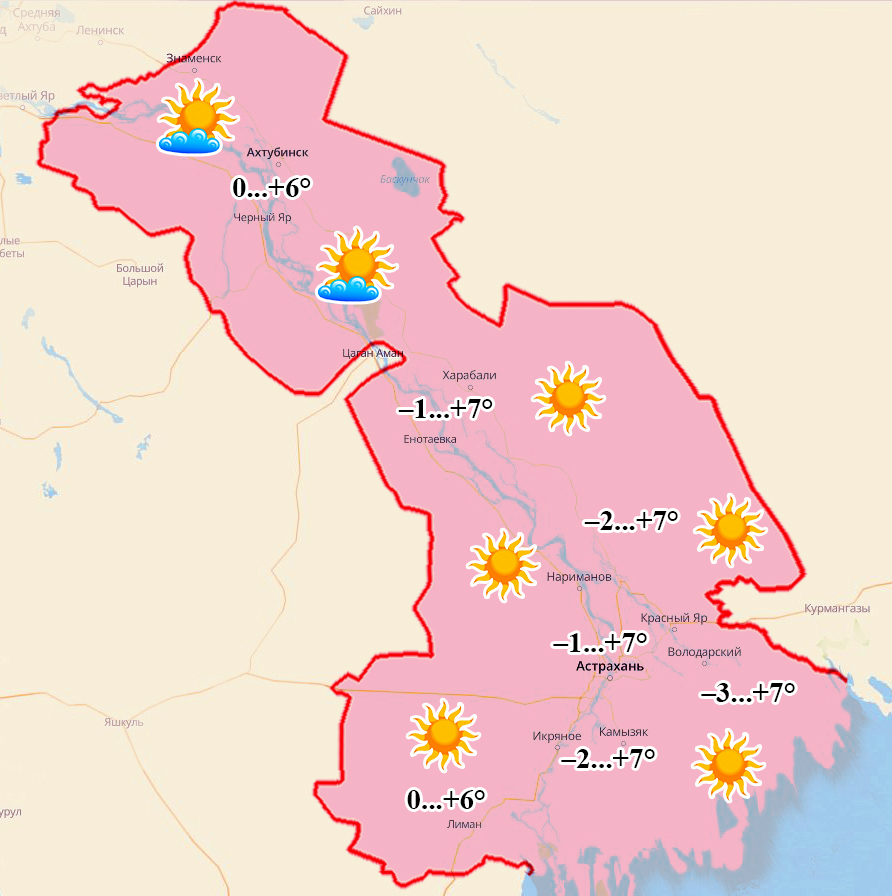 Харабали: ночью и утром –1°, днем +7°, ясно, ветер 1-3 м/с;