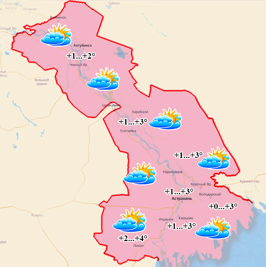 Ахтубинск: ночью и утром 0...+1°, днем +2°, облачно с прояснениями, незначительные осадки и туман на севере района, ветер 1-3 м/с;
