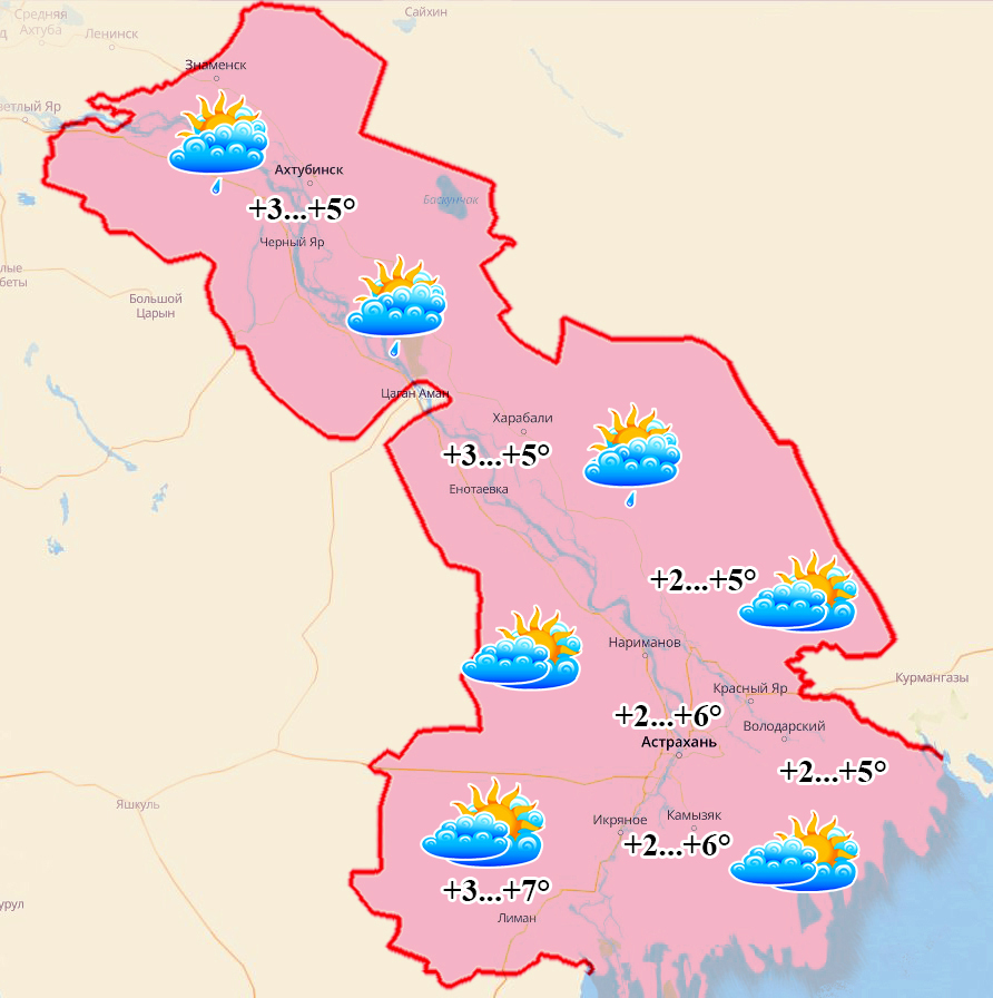 Ахтубинск: ночью и утром +3°, днем +5°, облачно с кратковременными прояснениями, ночью незначительные осадки, ветер 2-4 м/с;