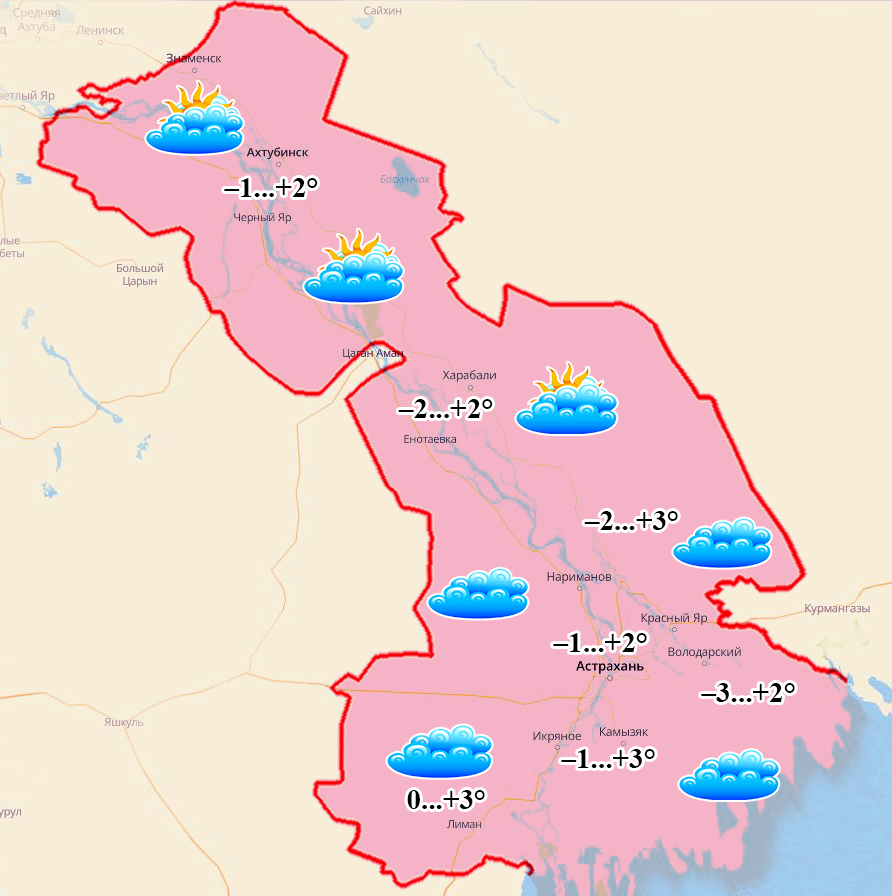 Харабали: ночью и утром –2°, днем +2°, пасмурно с прояснениями, ветер 3-8 м/с;