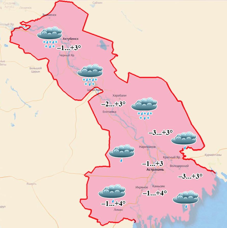 Енотаевка: ночью и утром –2°, днем +3°, пасмурно, кратковременные осадки в течение дня, ветер 3-7 м/с;