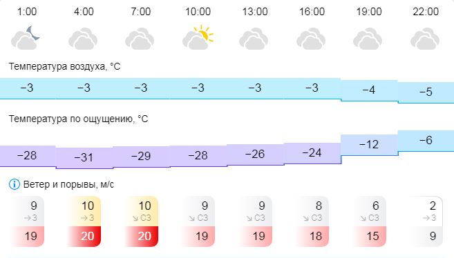 Как утверждает погодный портал Gismeteo, на фоне завтрашнего штормового ветра, температура –3…–5° будет ощущаться как –30°.