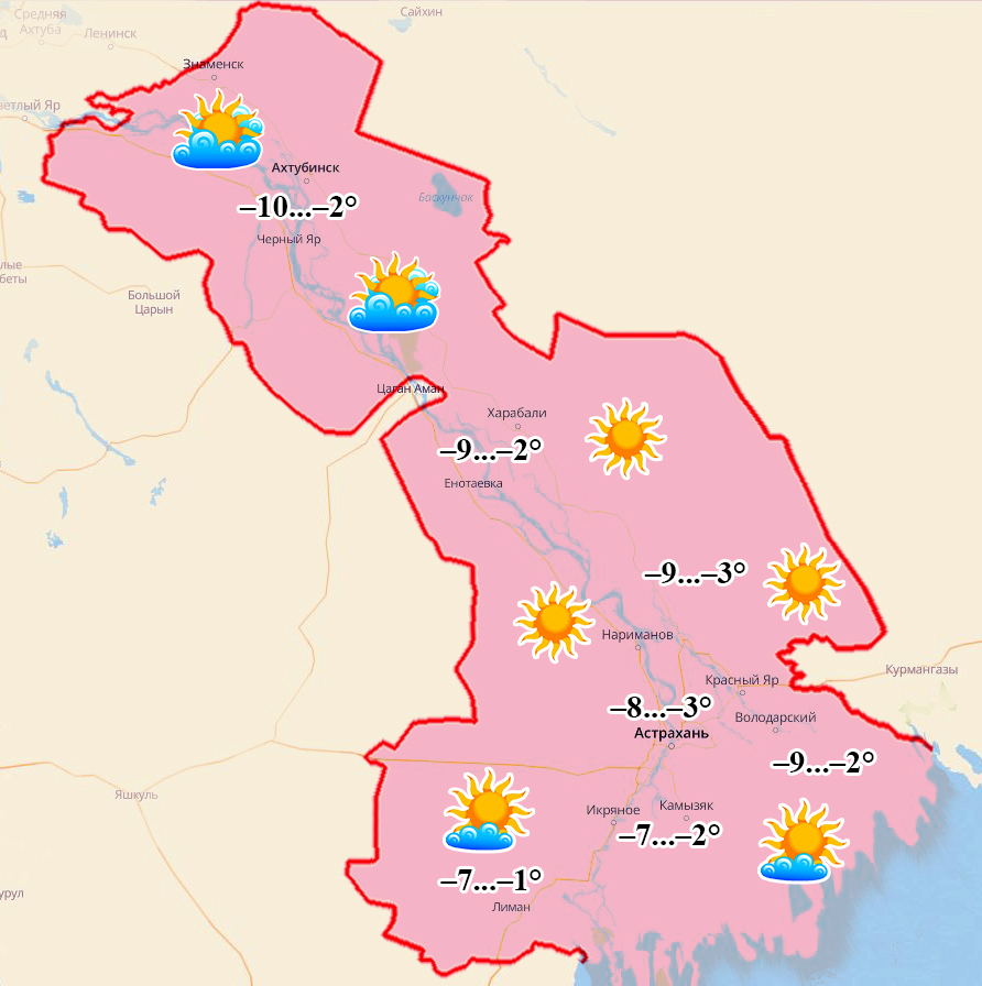 Ахтубинск: ночью и утром –10°, днем –2°, ветер 1-4 м/с;