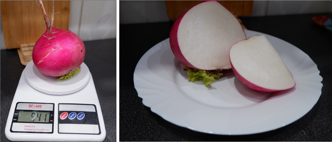 Внимание покупателей привлекает непривычный для астраханцев гигантский редис. По словам продавцов, его выращивают местные фермеры. Вес одной редиски может достигать от 300 грамм до килограмма. По вкусу он не отличается от обычного редиса, но в нем нет остроты. Продают его по цене 110 рублей за килограмм. Традиционный редис предлагают по цене 100 рублей за три пучка.