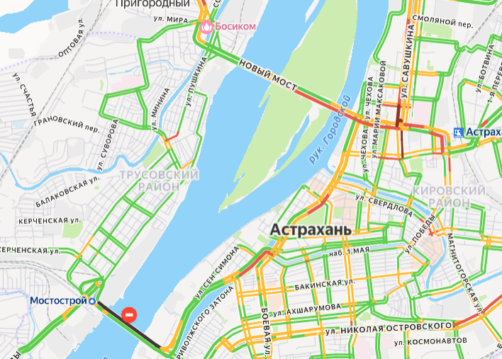 Между тем, на Новом мосту, согласно Яндекс. Пробкам, в настоящее время собираются заторы на полосе, которая ведет из Трусовского района. И причем красный пробки отмечаются только на второй половине моста, которая идет от поста ГАИ.