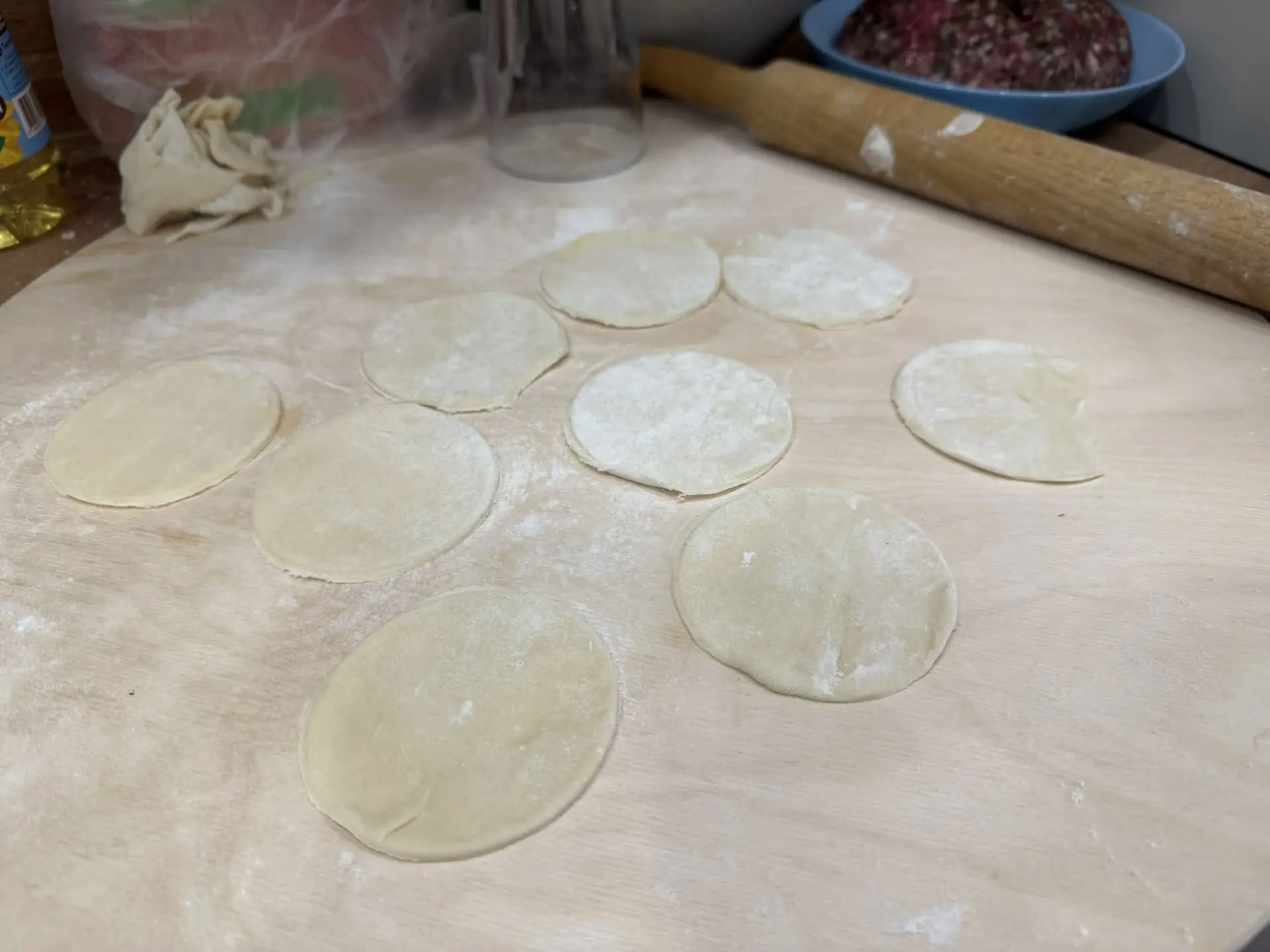 Ну а дальше раскатываем его, и я, например, посредством стакана выдавливаю кружочки из теста.