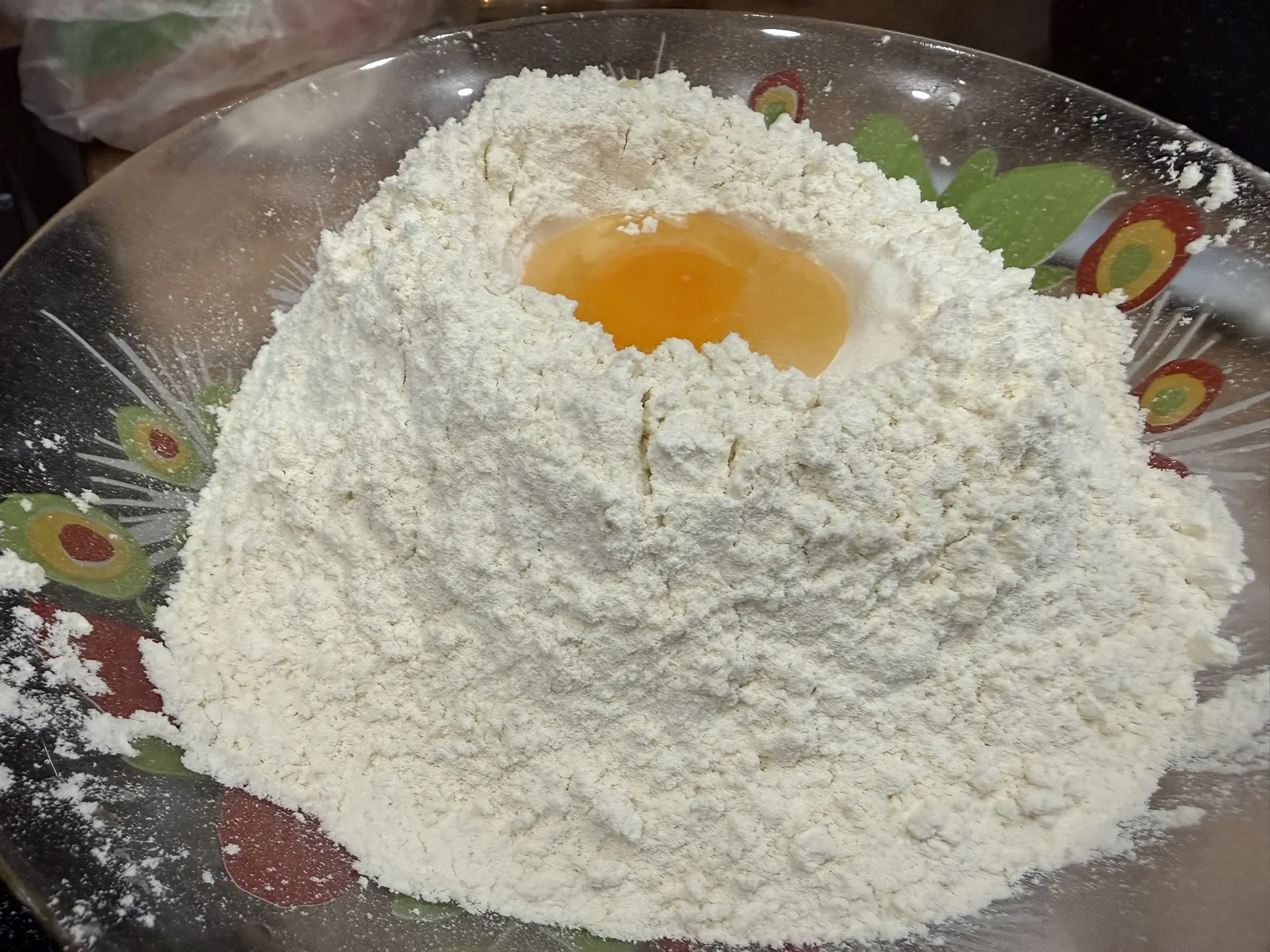 Теперь ставим тесто. Для этого берем 0,5 кг муки (30 ₽), одно яйцо, столовая ложка масла растительного, полчайной ложки соли (на это мы потратили приблизительно 15 ₽). Теперь в муку добавляем горячую воду и замешиваем тесто.