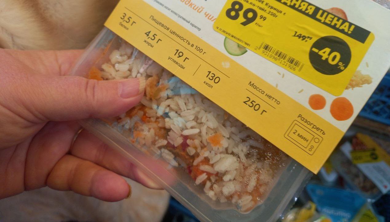 «Я лично для себя покупаю, а не для собачек», — вмешалась в разговор одна из постоянных покупательниц. Женщина выбирала фасованную готовую еду и придирчиво разглядывала упаковки. На большинстве была проставлена вчерашняя дата . «Вы же в холодильнике дома держите вчерашнюю еду. А что с этой должно быть не так? Я только рыбу не беру, онегири всяких побаиваюсь. А плов с курицей — самое то», — поделилась с нами пенсионерка. По прикидкам продавщицы, готовая еда обходится рублей в 50. Оказалось, что магазинные ценники неокончательные, продукция продается на вес, а оплата принимается только наличными.