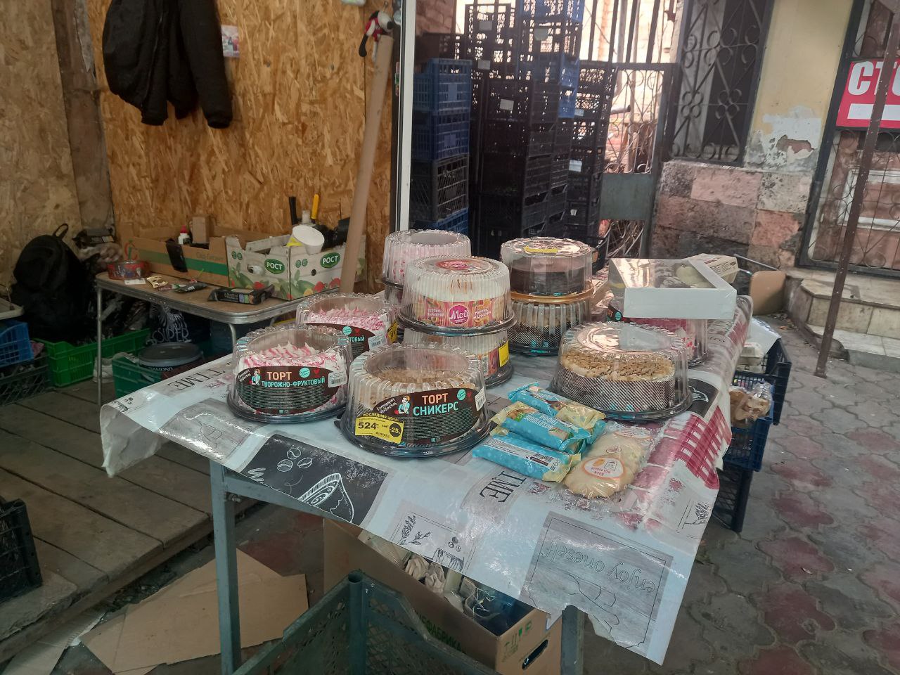 Неподалеку за прилавком с выпечкой и тортами стоял другой продавец. «Не боитесь тортами просроченными торговать?» — поинтересовались мы. Мужчина сразу начал открещиваться: мол, он тут только грузчик, ничего не знает, и вообще по какому праву мы здесь что-то фотографируем.