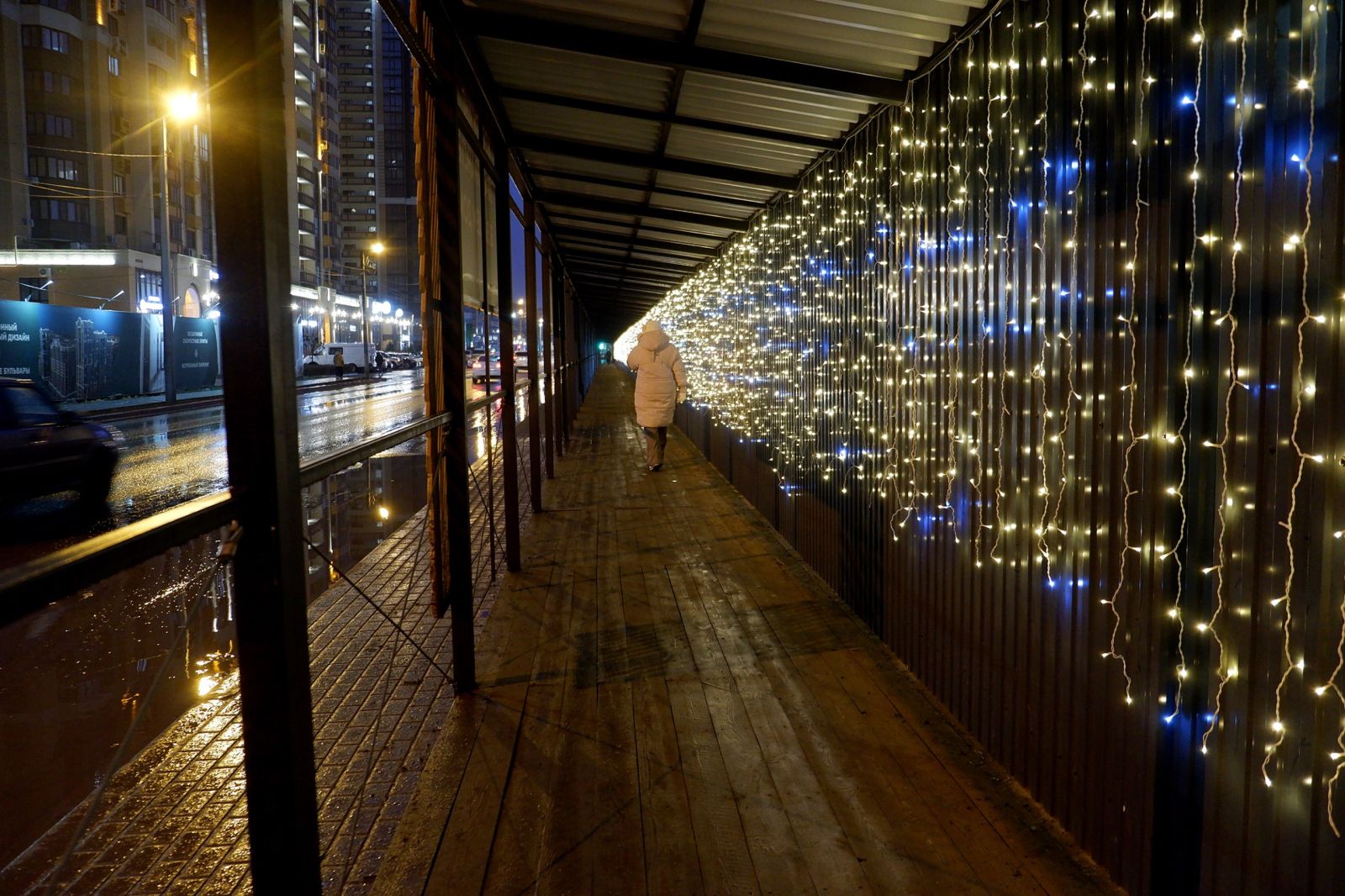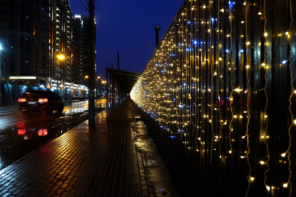 Скучный и очень длинный забор на улице Бакинской в один из предновогодних вечеров просто преобразился. Застройщик украсил его гирляндами.