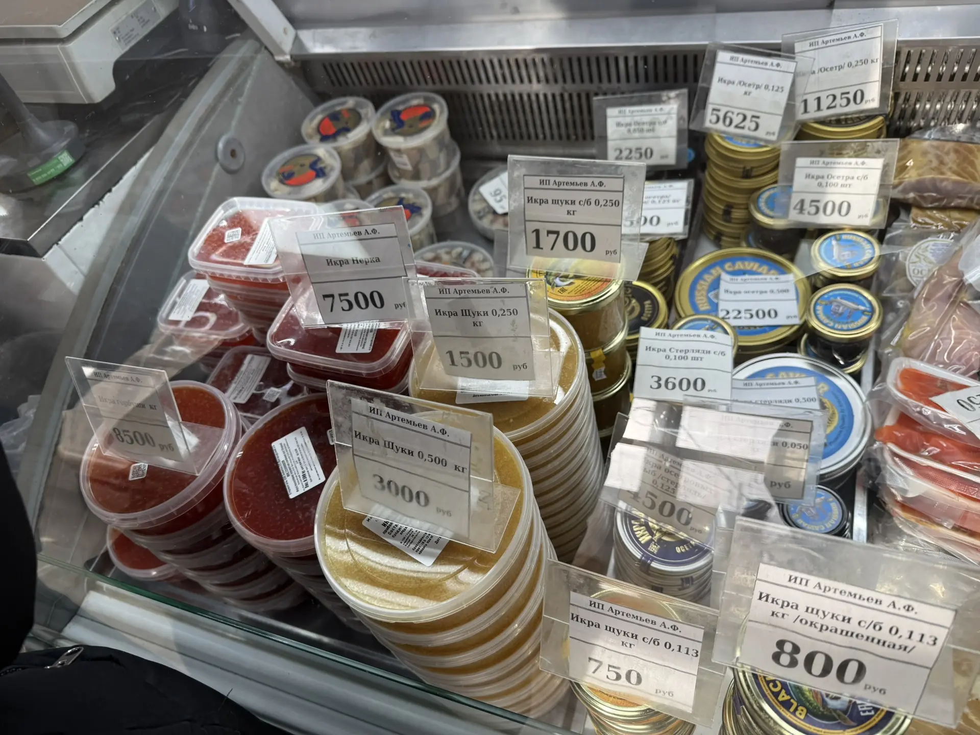 Хотите черной? Да вообще не вопрос! Официально в магазине со всеми документами икра черная, из стерляди — всего 36 тысяч рублей за килограмм. Господи, какие мелочи-то, возьму я подороже уж. Осетровая вон лежит спокойно по 45 тысяч за кило. Берем? А что не взять-то, взвесьте мне 50 гм, гулять так гулять, кушать так икру осетровую. 2250 рублей — и она твоя! Вкусная! Черная! Осетровая! Целых 50 гм! Ни в чем себе не отказывай, так сказать.