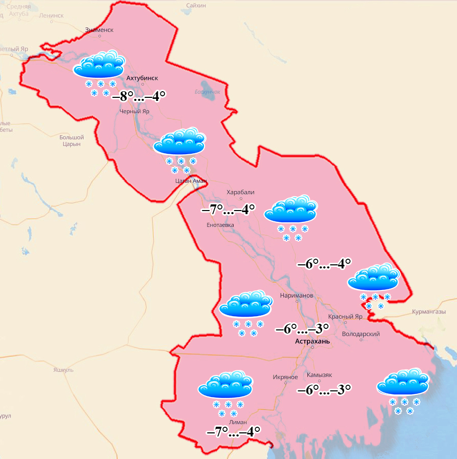 Харабали: ночью и утром –7°, днем –4°, пасмурно, снег, ветер 3-5 м/с;