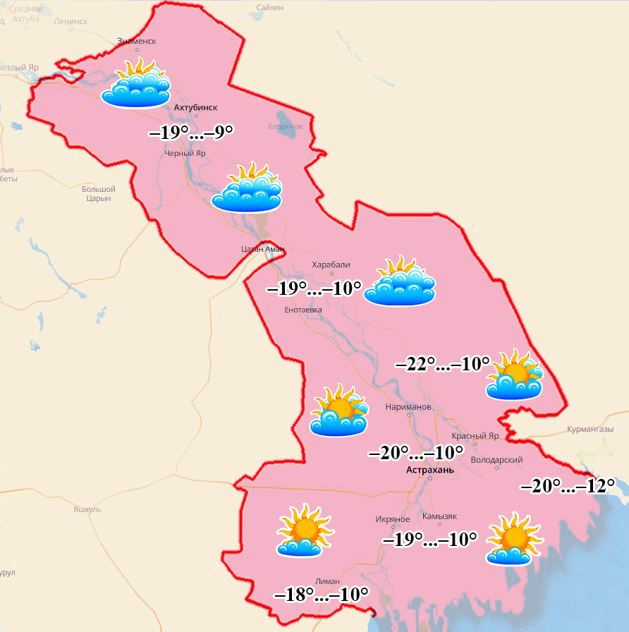 Харабали: ночью и утром –19°, днем –10°, переменная облачность, ветер 1-2 м/с;