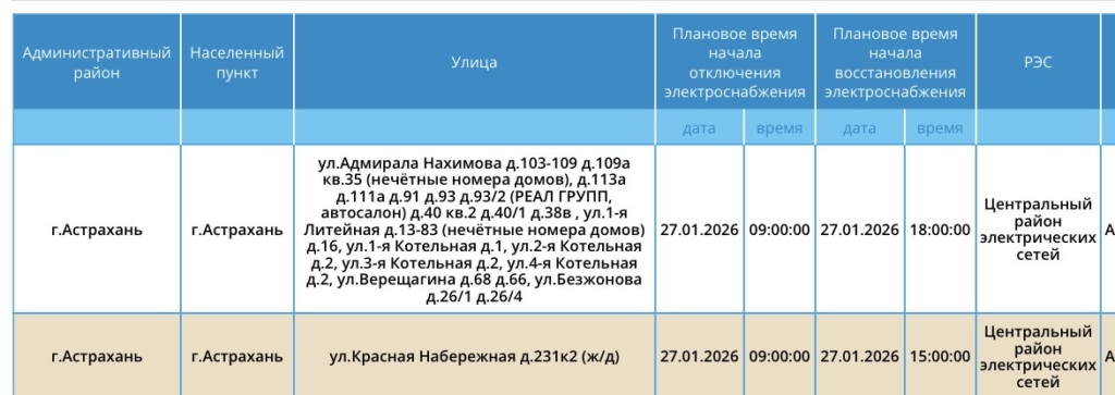 27 января в Астрахани планово отключат свет по ряду адресов.