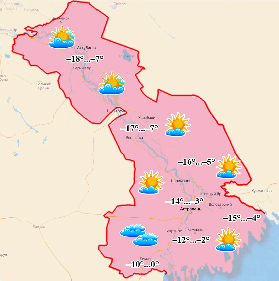 Ахтубинск: ночью и утром –18°, днем –7°, переменная облачность, ветер 5-9 м/с;