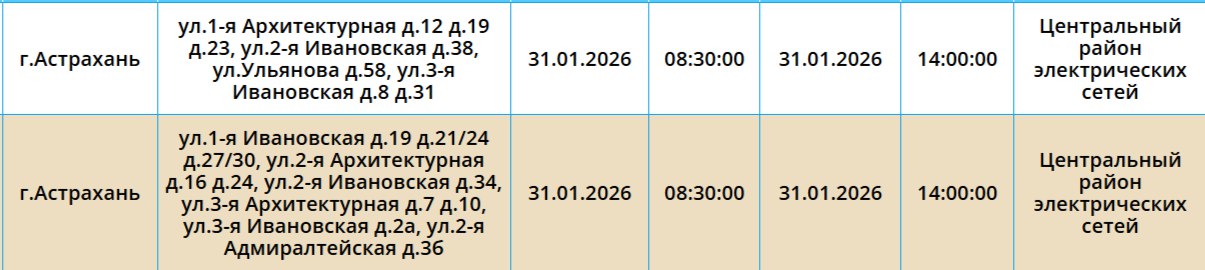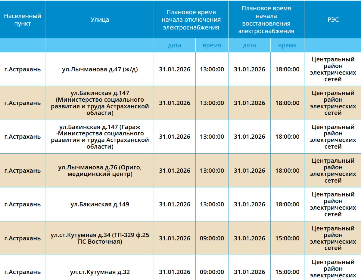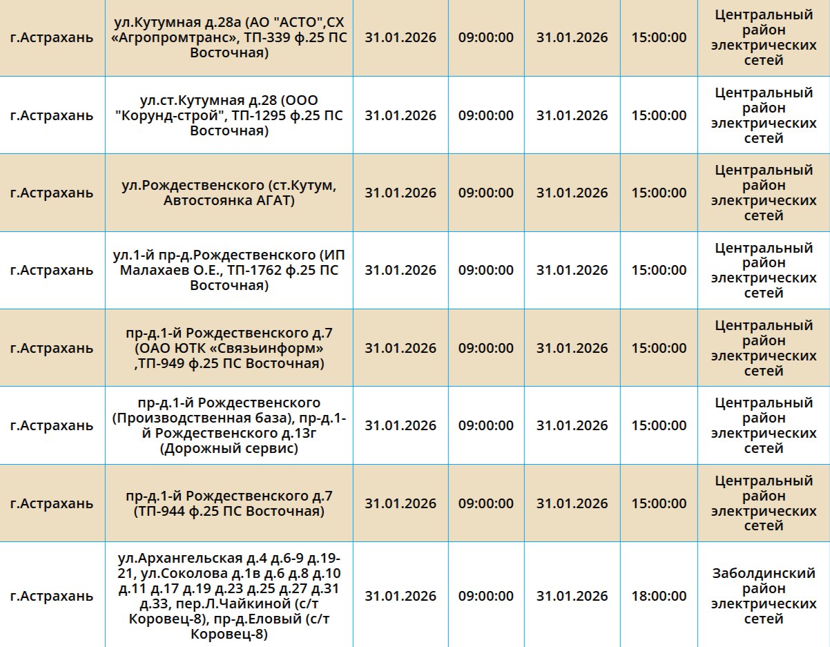 В Астрахани 31 января не будет света по следующим адресам: