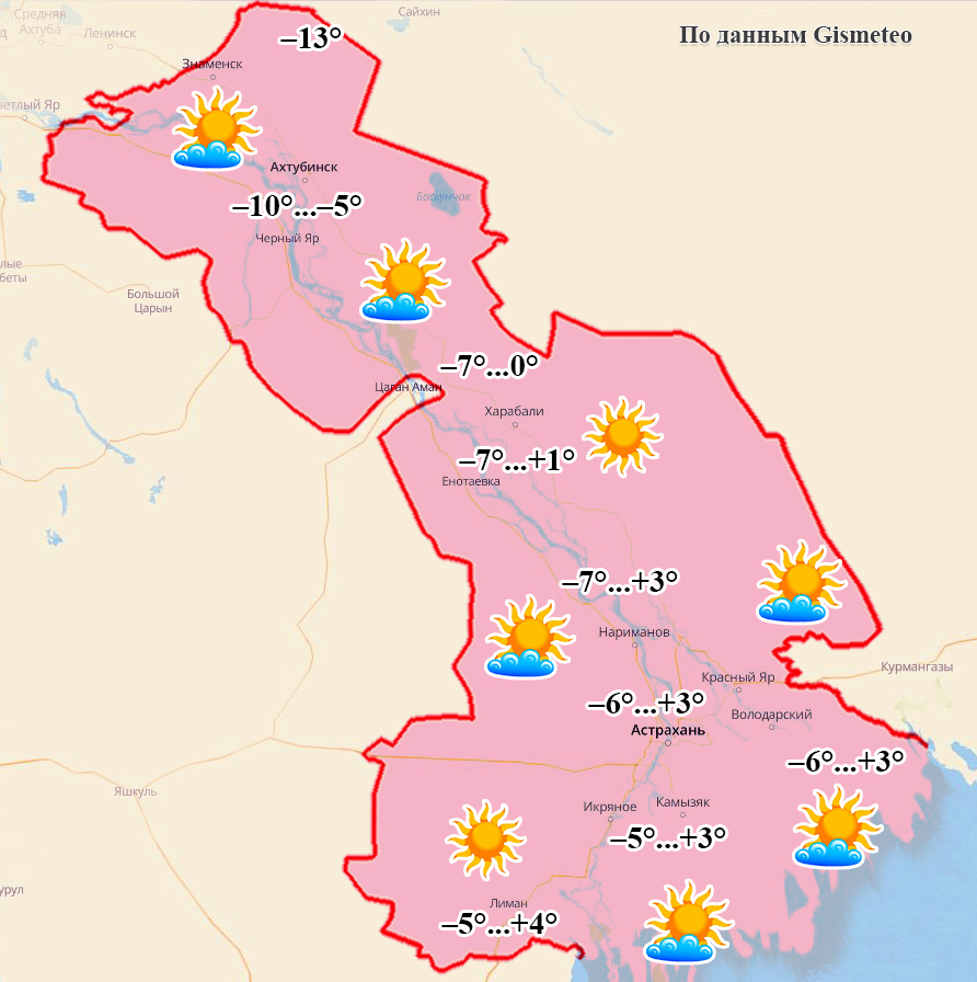 Харабали: ночью и утром –7°, днем 0°, переменная облачность, ветер 2-6 м/с;