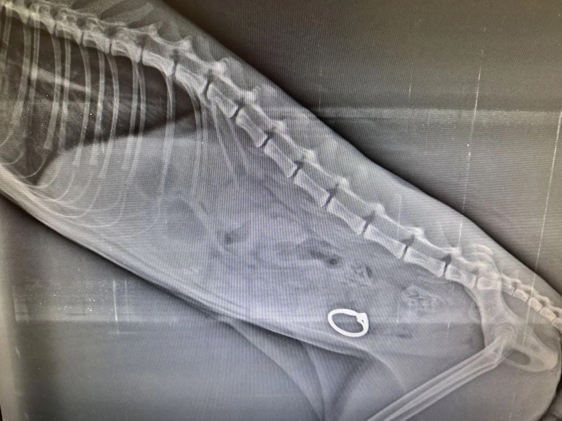 Рентген показал, что в толстом отделе кишечника у кота находится инородное дело. Ветеринары провели экстренную операцию. Из Масика достали кольцо с камнем. Металл частично окислился. У кота уже пошло осложнение из-за длительного пребывания в кишечнике украшения. Некротические ткани удалили, рассказали в ГБУ АО " Астраханская областная ветеринарная станция".