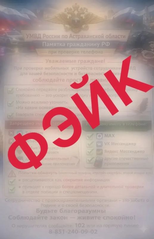 "УМВД России по Астраханской области официально заявляет, что данная информация не соответствует действительности, и призывает граждан для получения достоверной информации обращаться к официальным источникам ведомства", - сообщили в УМВД.