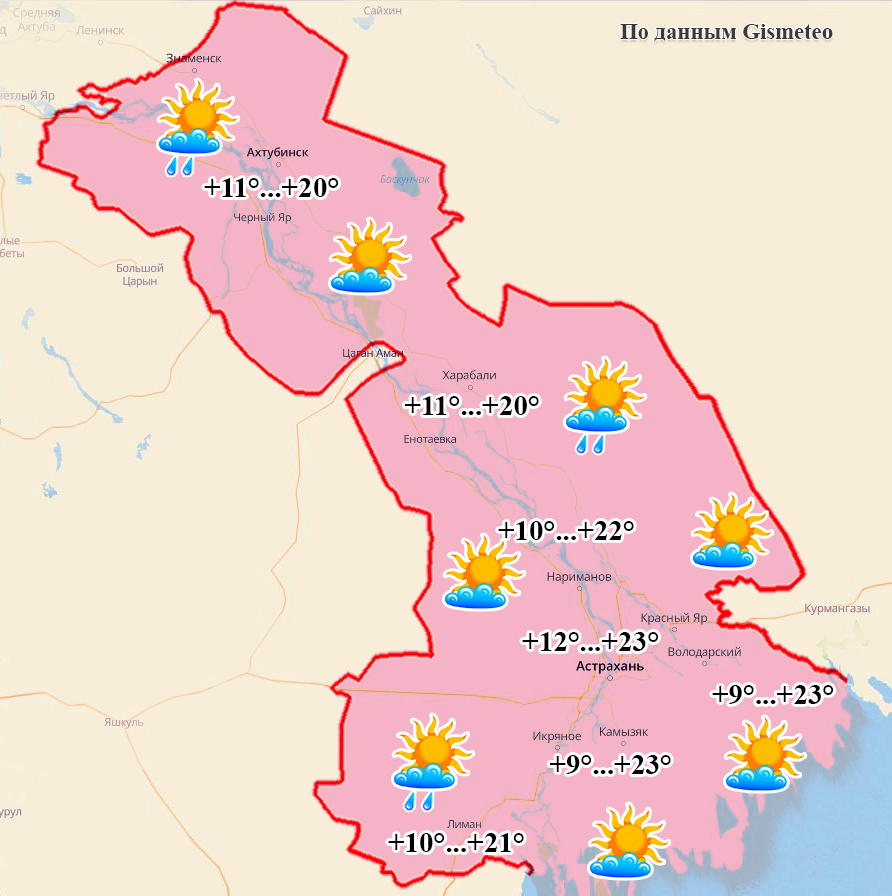 - Енотаевка: ночью и утром +11°, днем +20°, переменная облачность, днем незначительные осадки, ветер 4-7 м/с;
