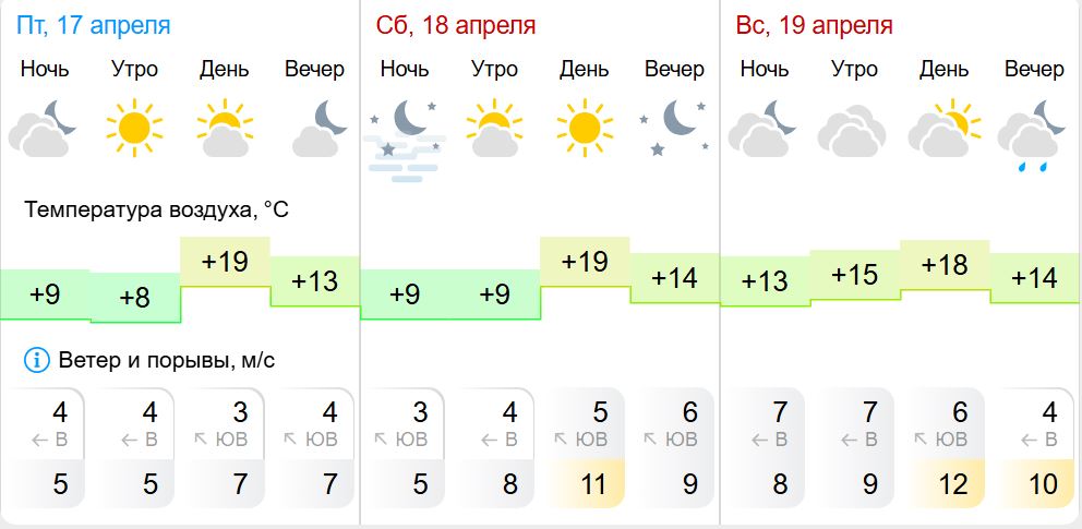 Воскресенье, 19 апреля, принесёт частично облачную погоду и чуть более прохладный день: от +15 до +18 градусов, ночью около +11…+13. Ветер сохранится восточный, умеренный, порывы до 12 м/с. Осадки местами ожидаются в вечернее время, так что можно спокойно завершать выходные на свежем воздухе.