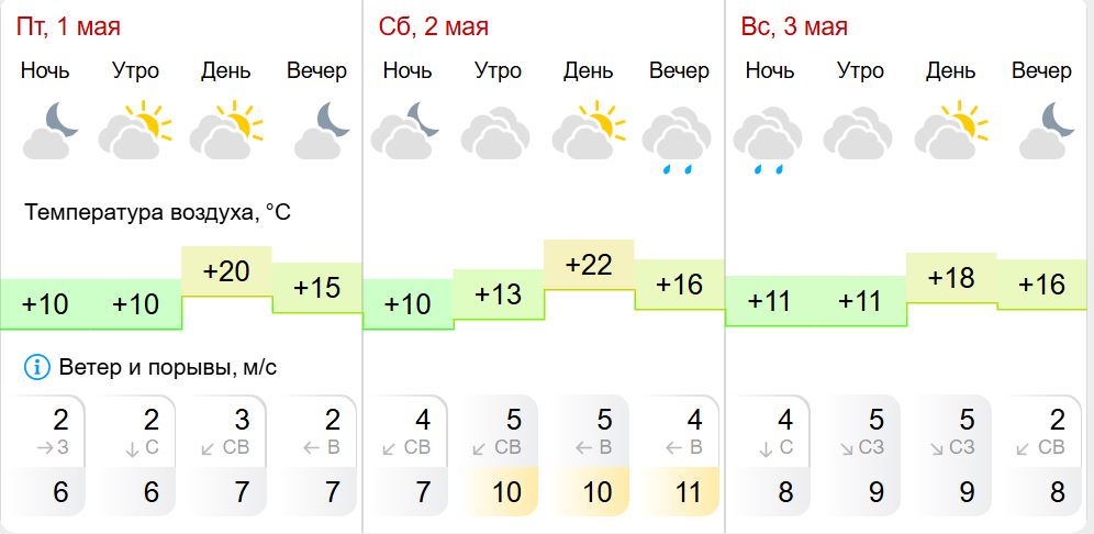 2 мая картина будет похожей, но ожидается усиление ветра и небольшие осадки. Однако, если они и начнутся, то ближе к вечеру. Ночью и утром температура воздуха составит +10...+13 °С. Днём столбик термометра поднимется до +23 °С. Ветер ожидается умеренный северо-восточный и восточный, 4-5 м/с, с порывами до 10-11 м/с.